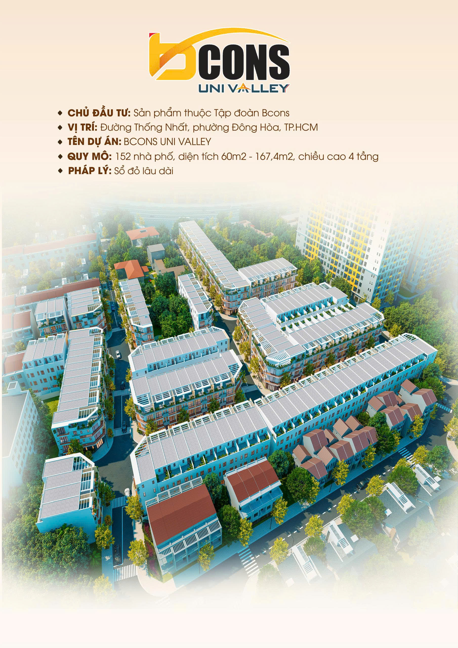Nhà phố Bcons Uni Valley khu Bcons Plaza Thống Nhất nằm ở số 22a Thống Nhất Đông Hòa Dĩ An. Đây là khu dự án nhà phố Compound duy nhất của tập đoàn Bcons cho đến hiện tại. Với 152 căn nhà phố thiết kế hiện đại với 1 trệt 2 lầu 1 tum diện tích từ 60m2. Báo giá nhà phố Bcons Plaza (Bcons Uni Valley) Thống Nhất bàn giao hoàn thiện cơ bản mặt ngoài, bàn giao thô phần trong. Tên gọi của dự án được lấy cảm hứng và lợi thế từ vị trí ngay Khu đô thị Đại học Quốc gia TP.HCM với hàng chục nghìn Sinh viên, Giáo sư – Tiến sĩ và Giảng viên đang sinh sống, học tập, làm việc trong khu vực này.