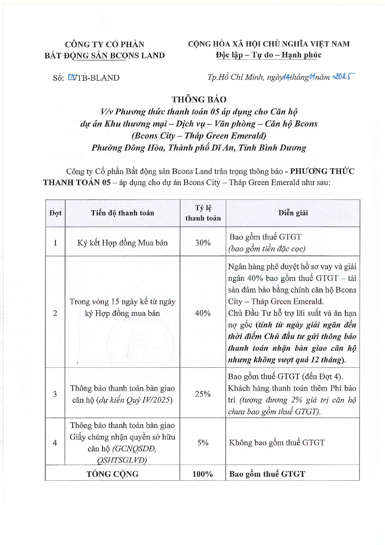 Bcons Green Emerald áp dụng 3 phương thức thanh toán cho khách hàng lựa chọn theo tiến độ hoặc nhận hỗ trợ vay vốn từ ngân hàng.