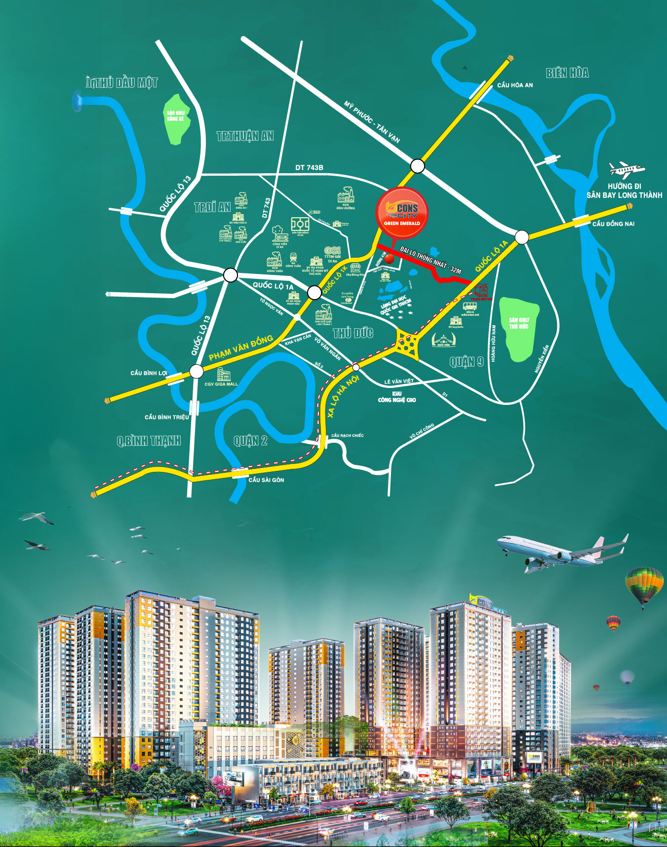 TP. Thủ Đức, TP.HCM, Thuận An, Biên Hòa chỉ trong vài phút qua Quốc lộ 1K và Đại lộ Võ Nguyên Giáp (Xa lộ Hà Nội). Ga Metro Bến Thành – Suối Tiên, Bến xe Miền Đông mới, KDL Suối Tiên nằm trong bán kính chỉ 5 – 10 phút di chuyển. Trung tâm hành chính Dĩ An, công viên Dĩ An, và các tiện ích đô thị khác đều tiếp cận nhanh chóng, thuận tiện. Với mạng lưới giao thông hoàn chỉnh và vị trí trung tâm chiến lược, Green Emerald mang đến khả năng kết nối vùng vượt trội cho cư dân và nhà đầu tư.