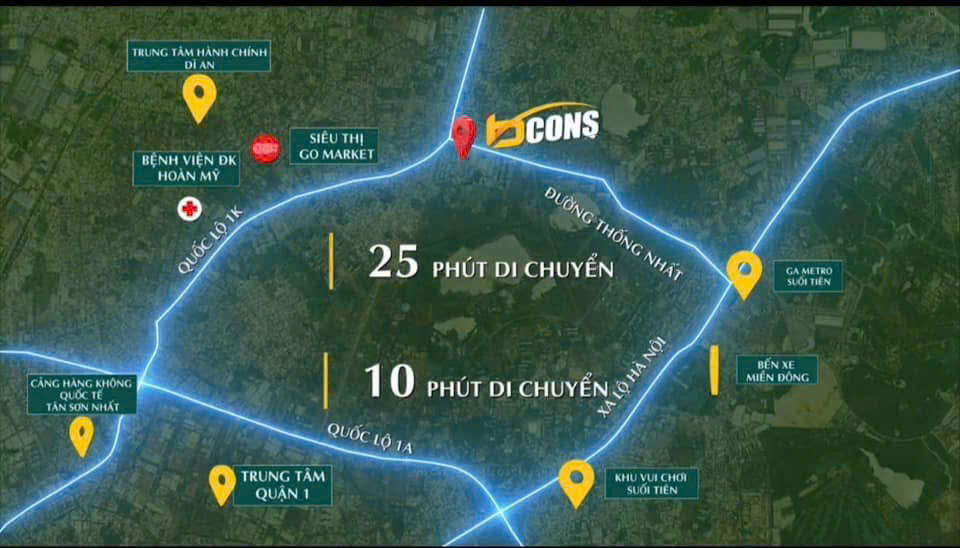 Từ dự án, khách hàng có thể di chuyển về trung tâm các thành phố lân cận như Thủ Đức, TP.HCM, Thuận An, Biên Hòa,….chỉ trong ít phút thông qua tuyến đường QL1K hay Đại lộ Võ Nguyên Giáp ( Xa lộ Hà Nội). Đồng thời, ở vị trí này, mất chưa đầy 10 phút, cư dân có thể sử dụng các tiện ích sinh hoạt vùng như: TTHC Dĩ An, công viên Dĩ An, KDL Suối Tiên, Ga Metro, Bến xe Miền Đông mới,…