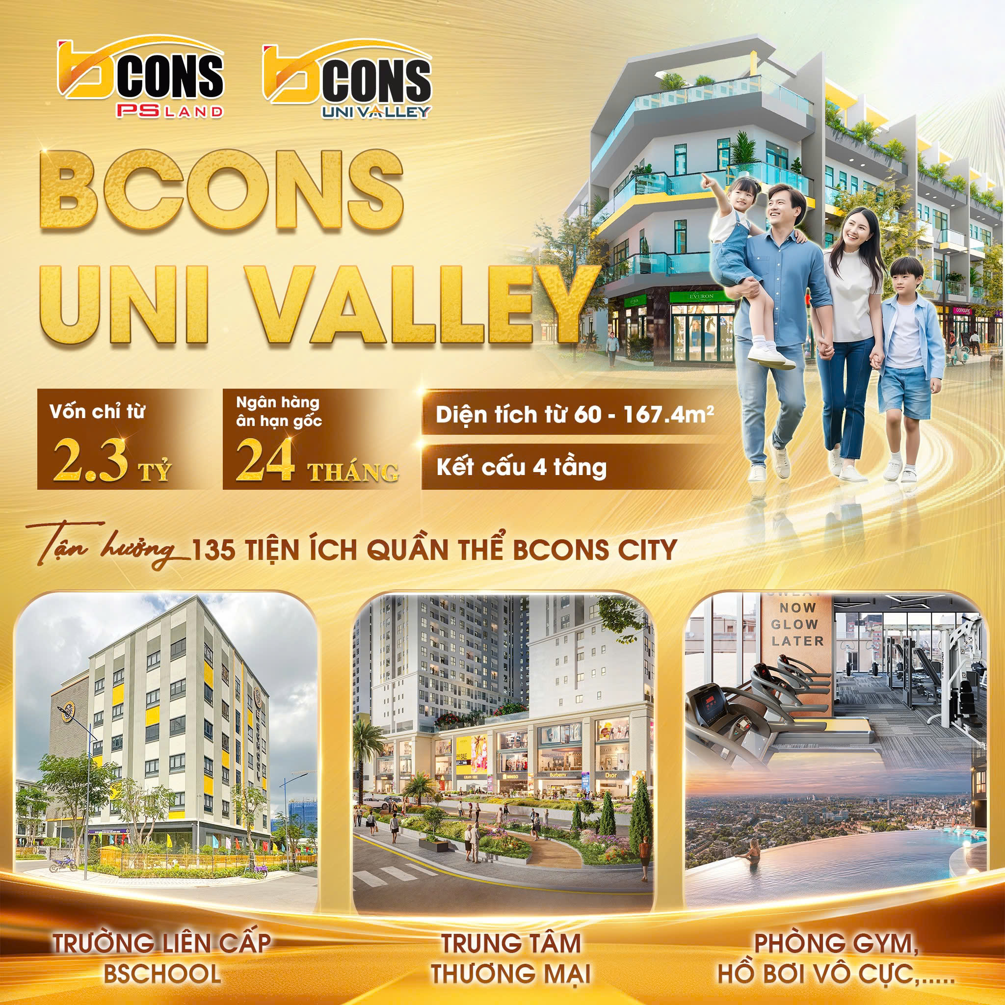 Nhà phố Bcons Uni Valley tọa lạc trên trục Thống Nhất, P. Đông Hòa, TP. Dĩ An (Bình Dương), thuộc quần thể Bcons City và liền kề Làng Đại học Quốc gia. Sản phẩm hướng đến nhu cầu vừa ở vừa kinh doanh, thiết kế điển hình 1 trệt – 2 lầu – 1 tum, nhiều lựa chọn diện tích linh hoạt. Từ dự án, cư dân thuận tiện kết nối Metro Suối Tiên, Bến xe Miền Đông mới, QL1K, Xa lộ Hà Nội và Phạm Văn Đồng; đồng thời thụ hưởng hệ tiện ích học tập, y tế, thương mại sẵn có của khu Đông. Thông tin mang tính tham khảo, giá bán và chính sách áp dụng theo thông báo chính thức của Chủ đầu tư tại thời điểm giao dịch.